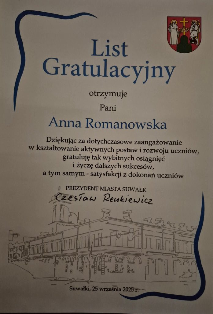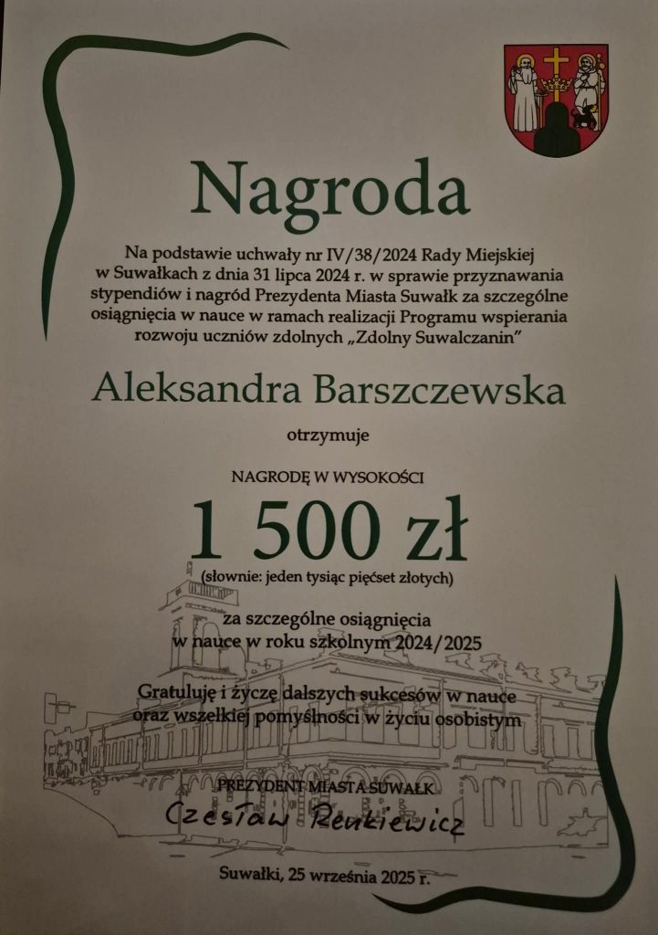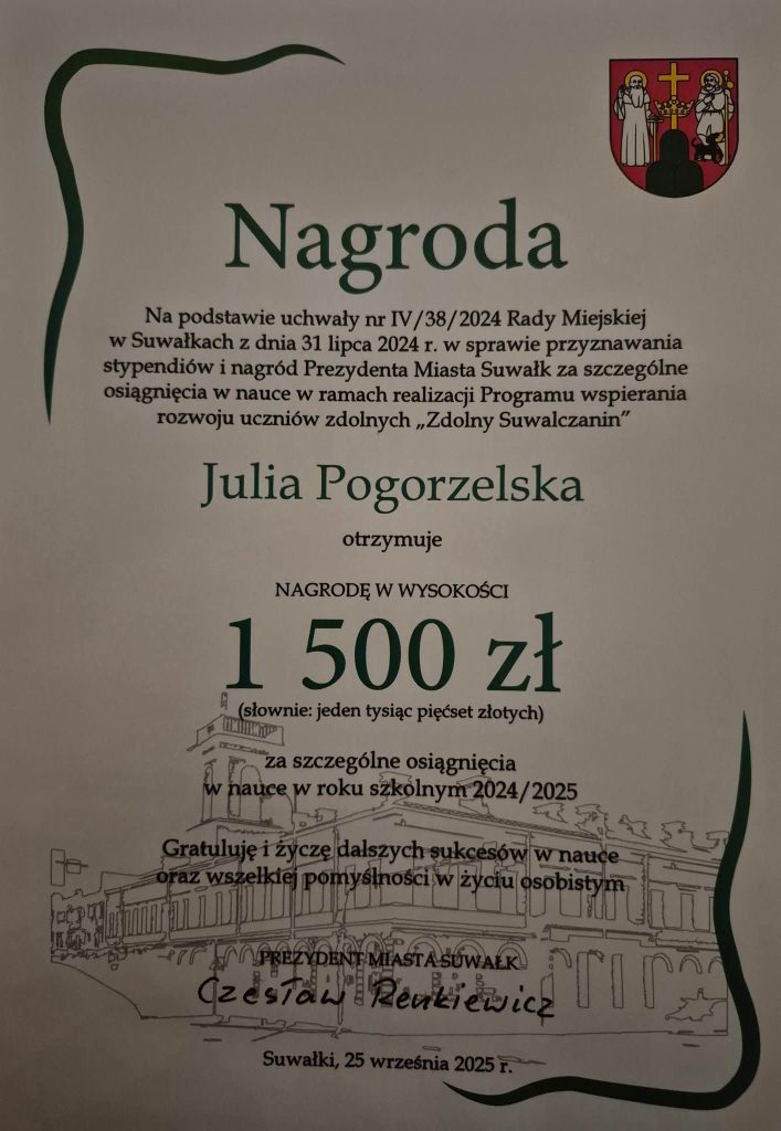 Dziś dwie nasze uczennice otrzymały Nagrody Prezydenta Miasta Suwałk za szczególne osiągnięcia w nauce w roku szkolnym 2024/2025. Serdecznie gratulujemy Oli i Julce oraz p. Annie Romanowskiej, która przygotowała dziewczyny do Olimpiady Wiedzy o Turystyce. Życzymy dalszych sukcesów w bieżącym roku szkolnym.